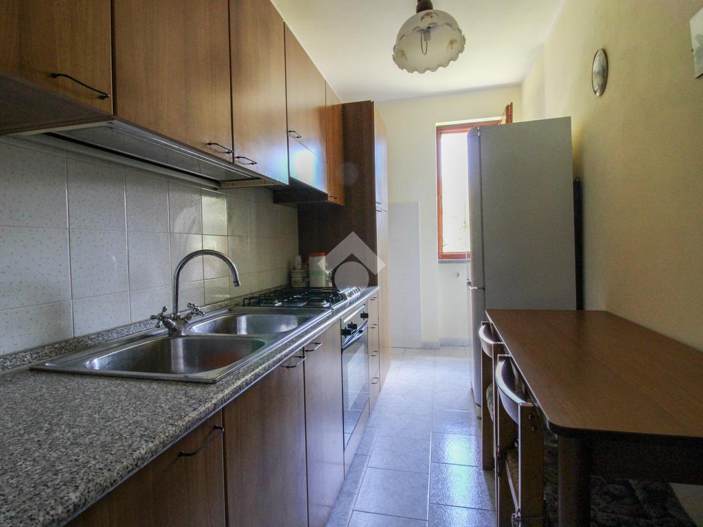 A sinistra, troviamo la zona giorno con camino a legna e la cucina separata abitabile.