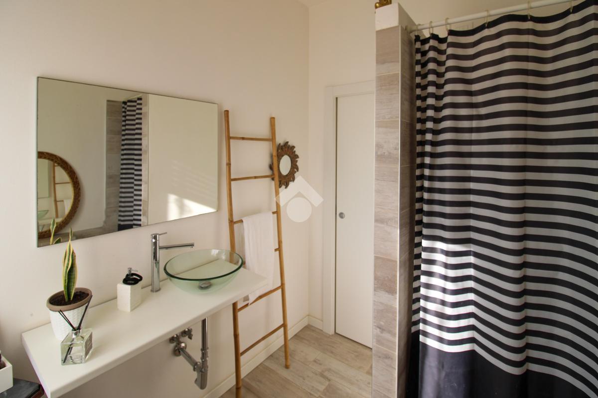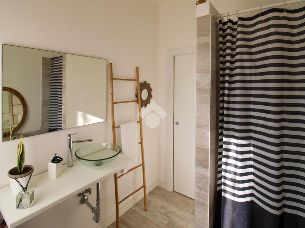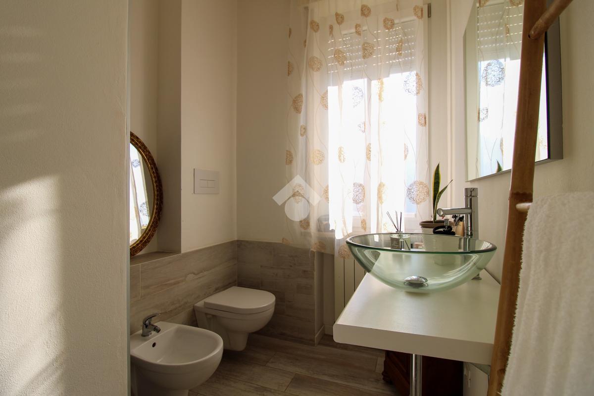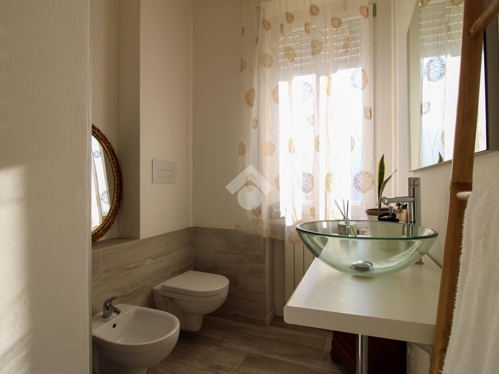 Frontalmente è presente il bagno finestrato con sanitari in ceramica e box doccia.