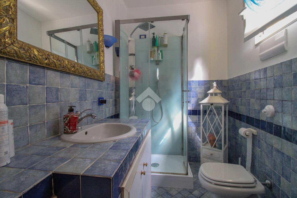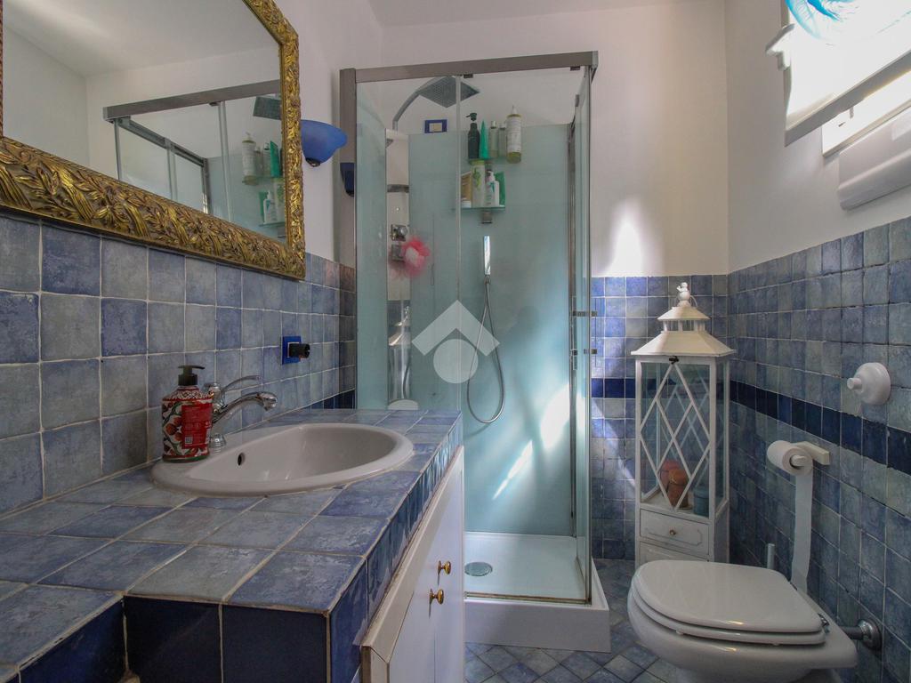 A destra è presente un bagno finestrato dotato di sanitari in ceramica e box doccia.