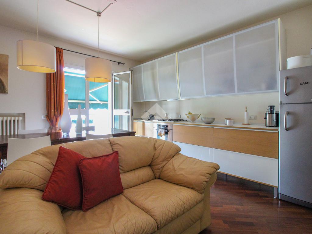 A sinistra troviamo l’ampia e luminosa zona giorno con cucina a vista.