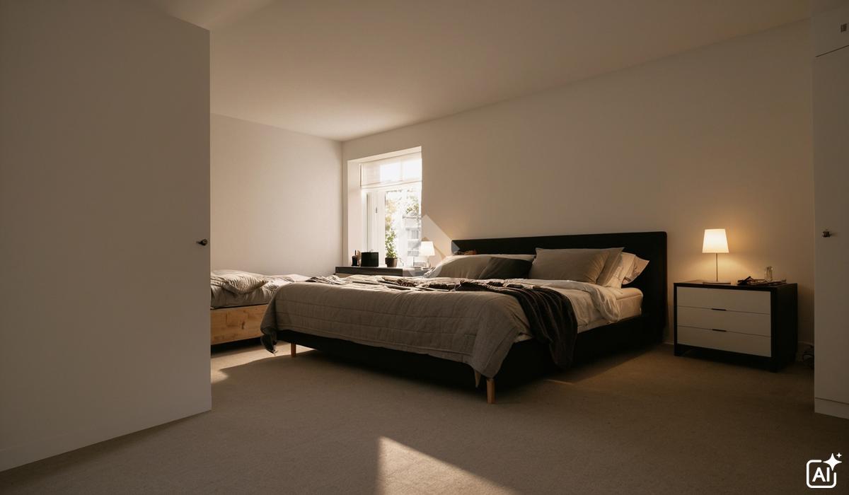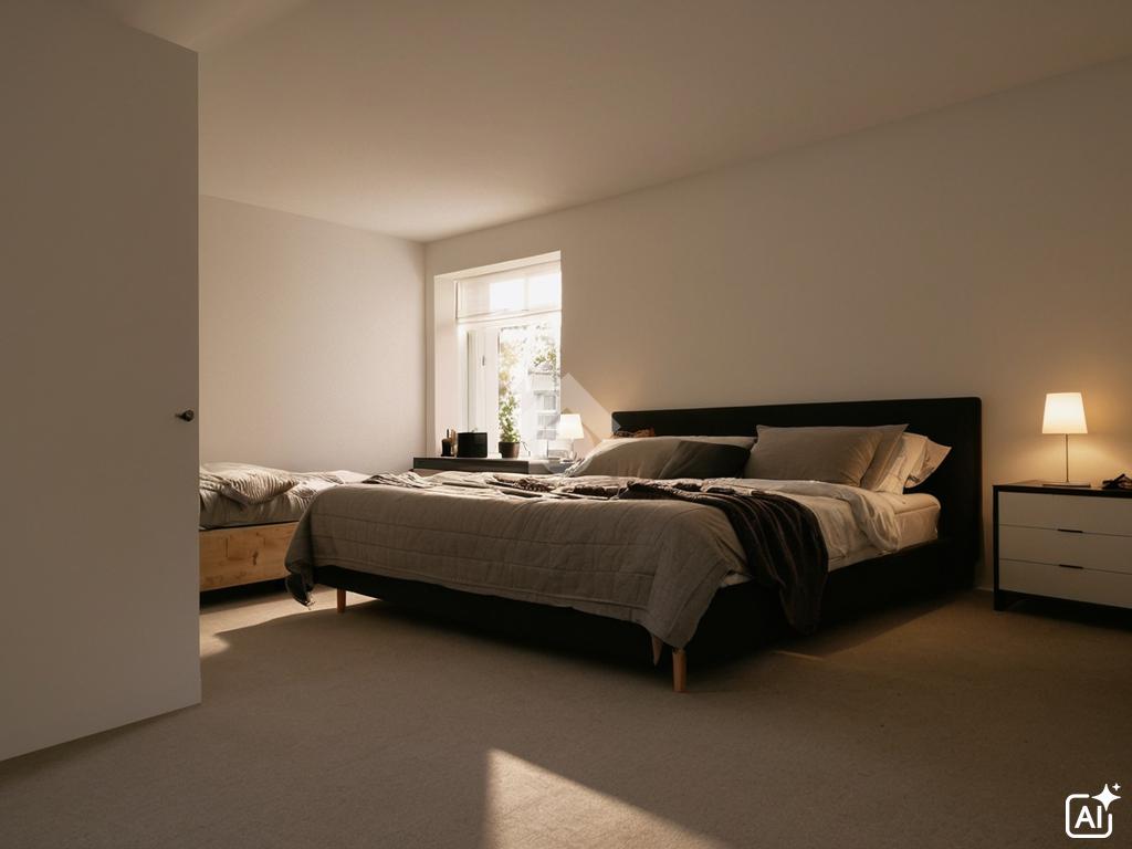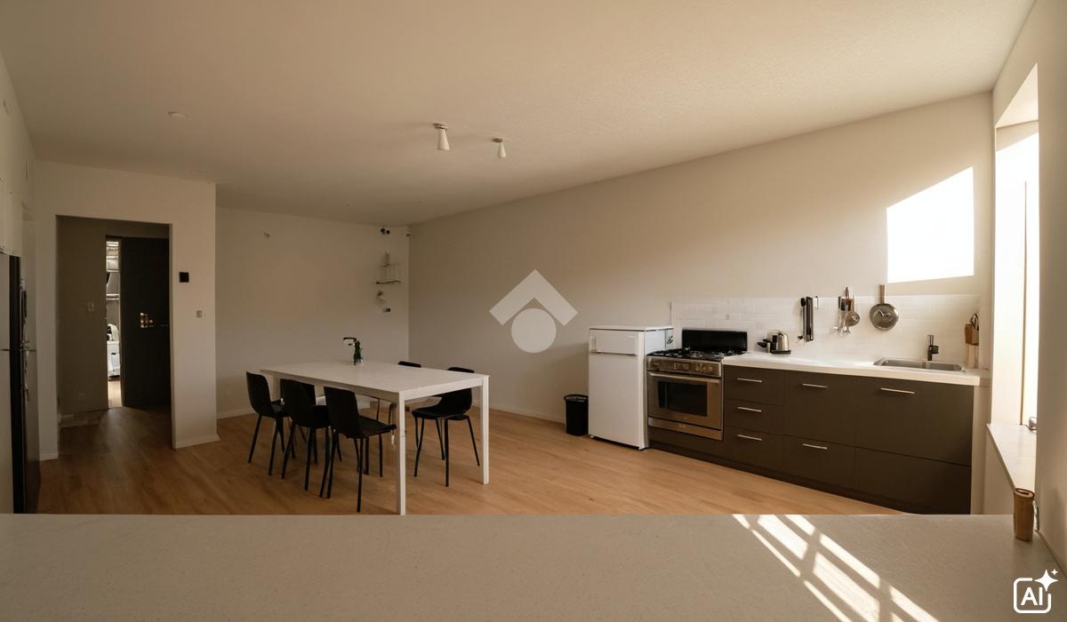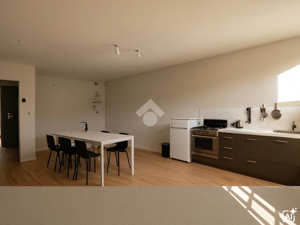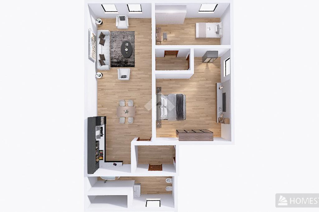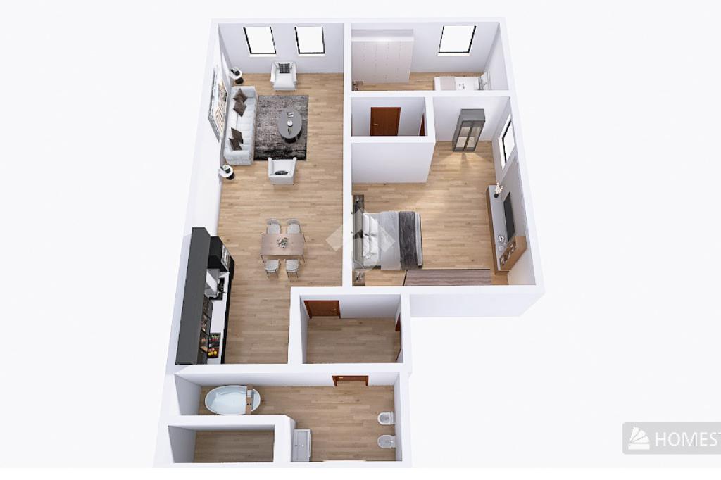 A destra un’ampia e luminosa zona giorno con cucina a vista e due camere da letto matrimoniali, a sinistra un bagno finestrato con box doccia o vasca.