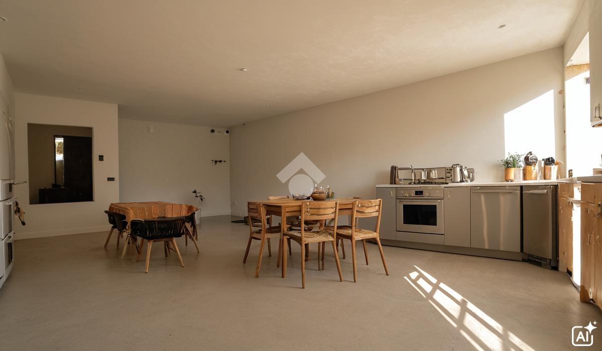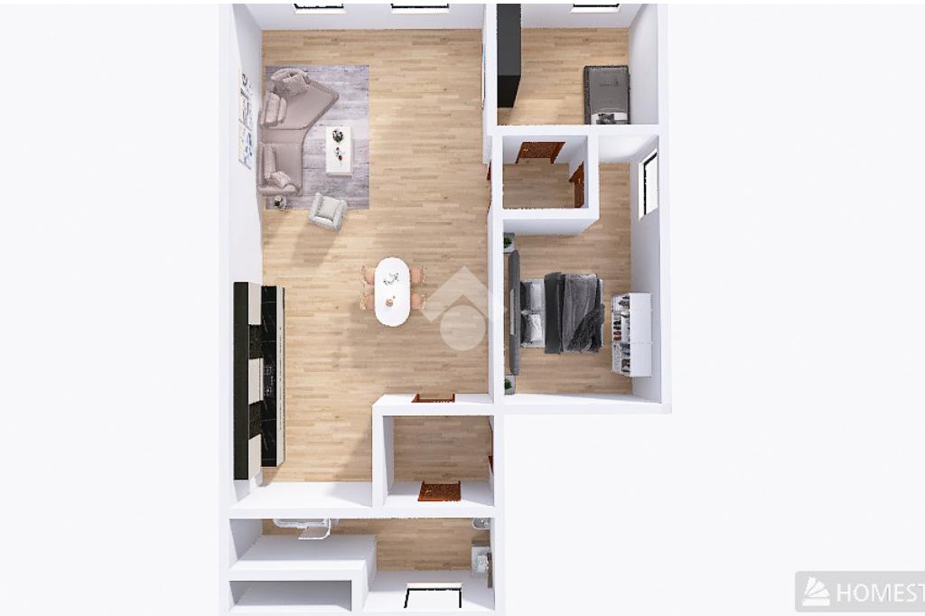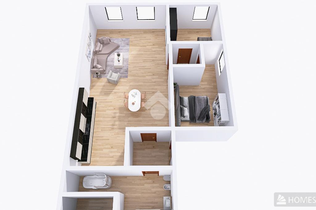 A destra un’ampia e luminosa zona giorno con cucina a vista e due camere da letto matrimoniali, a sinistra un bagno finestrato con box doccia o vasca.