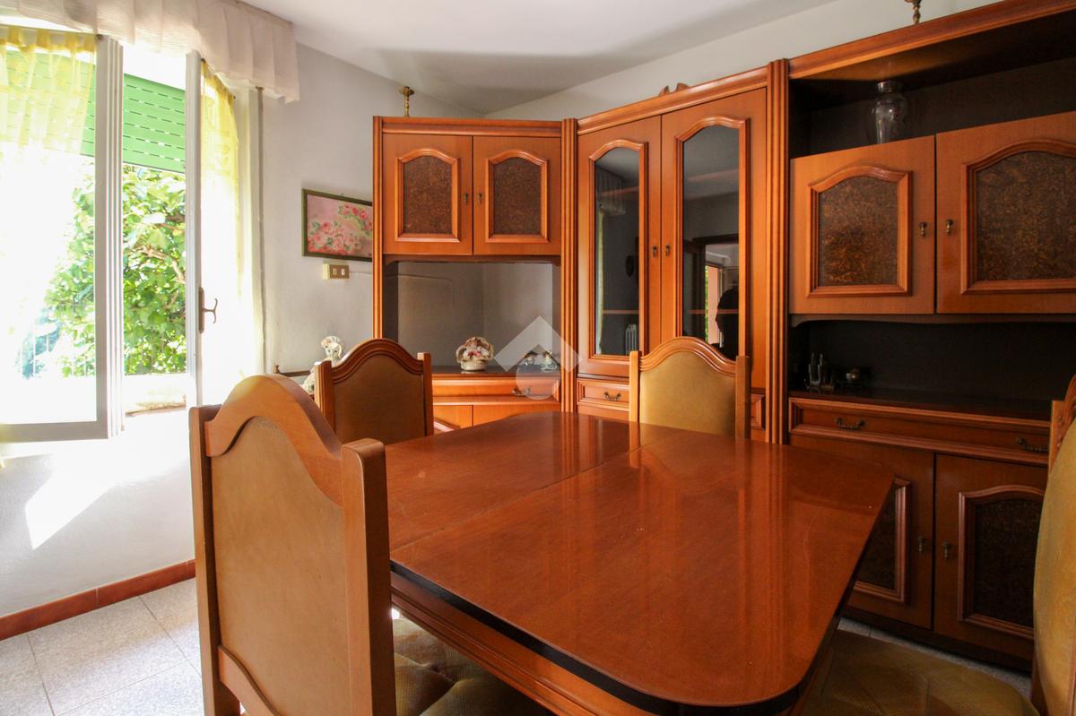 Accediamo alla seconda unità abitativa composta da una luminosa ed ampia zona giorno con sala da pranzo e cucina a vista, che ci fornisce, tramite portafinestra, accesso al cortile esterno.