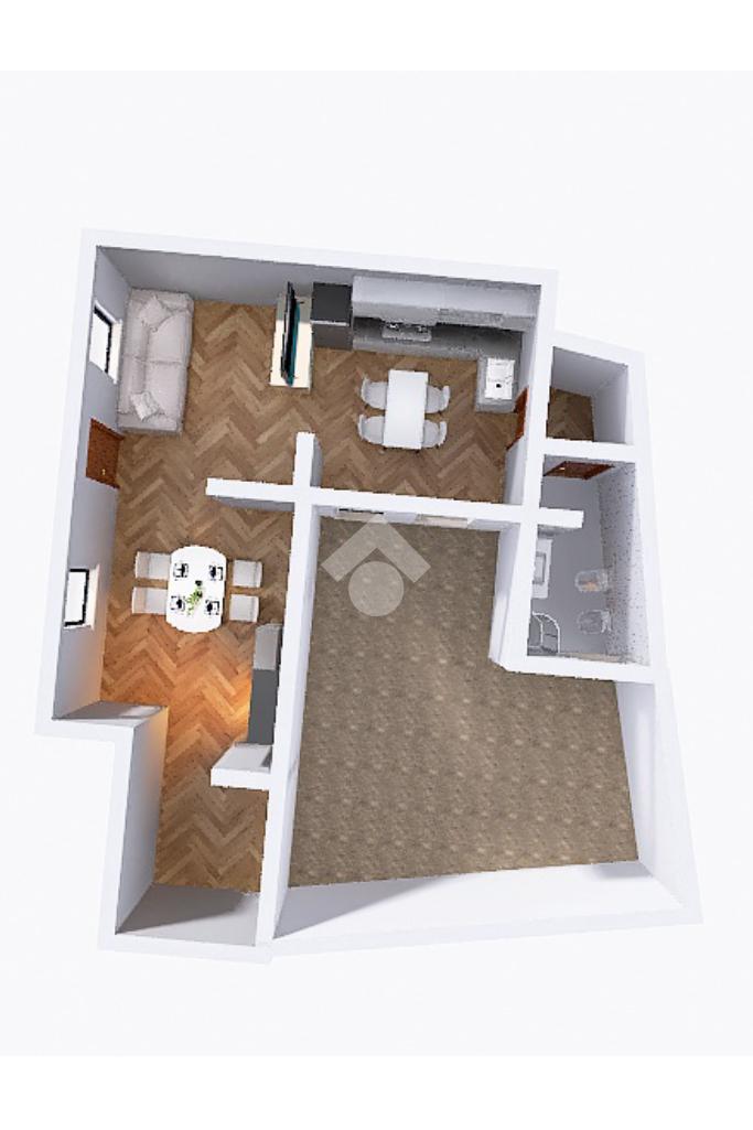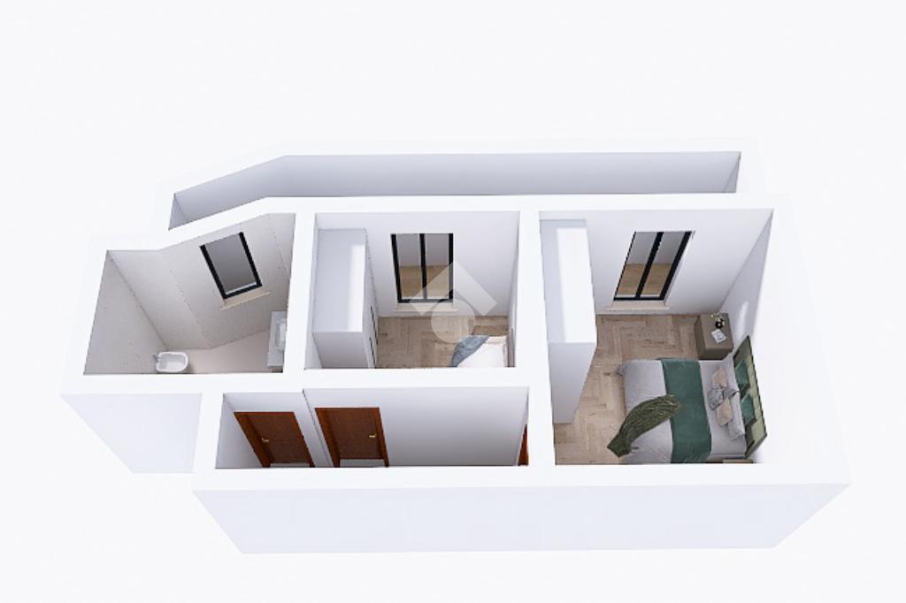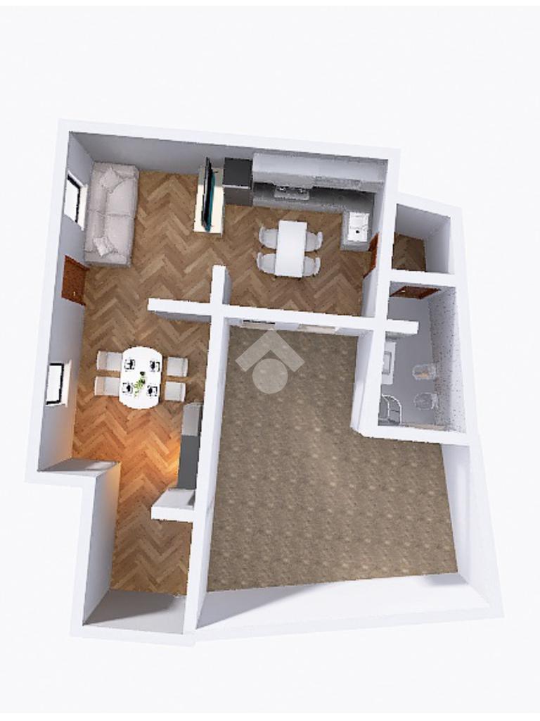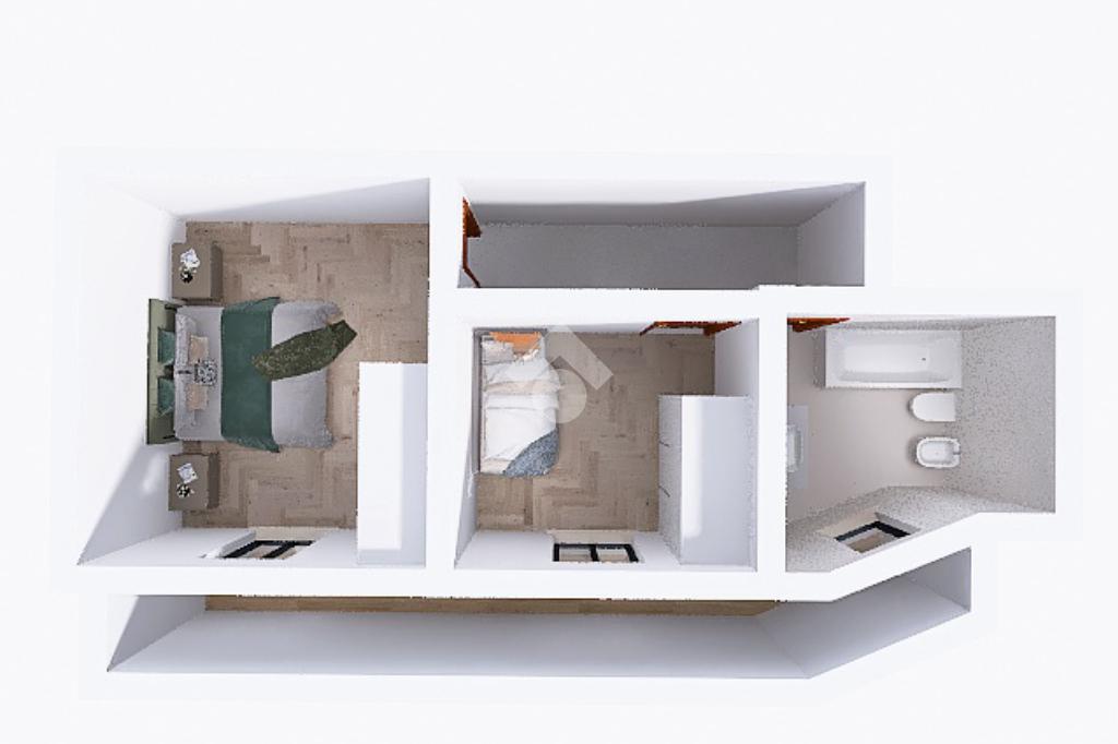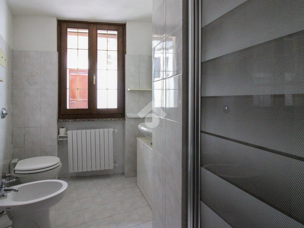 Completa il piano un bagno finestrato con sanitari in ceramica e box doccia, dotato di allacci per la lavatrice.