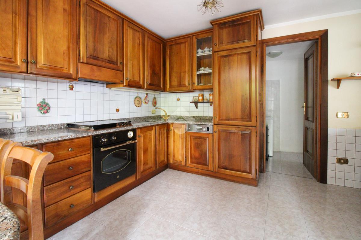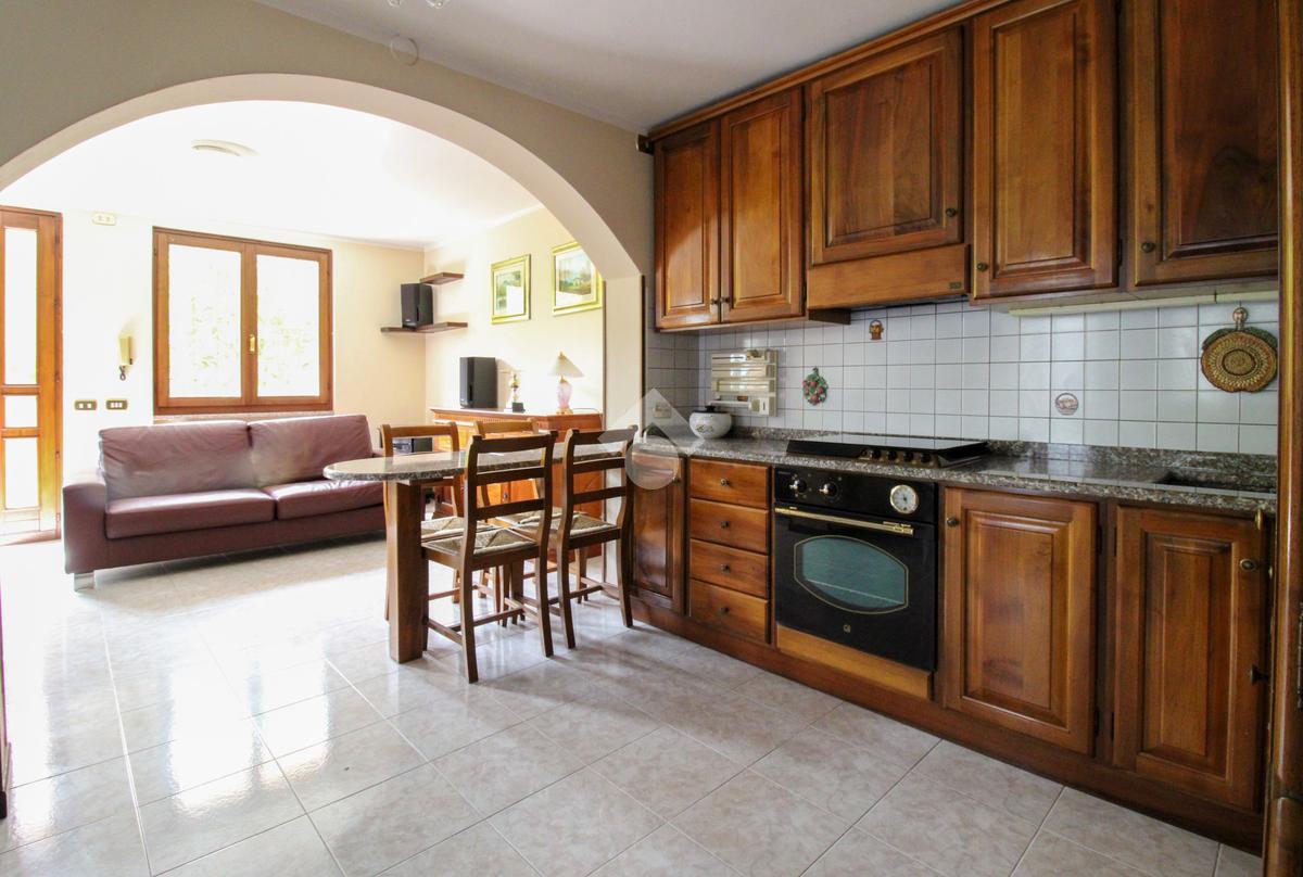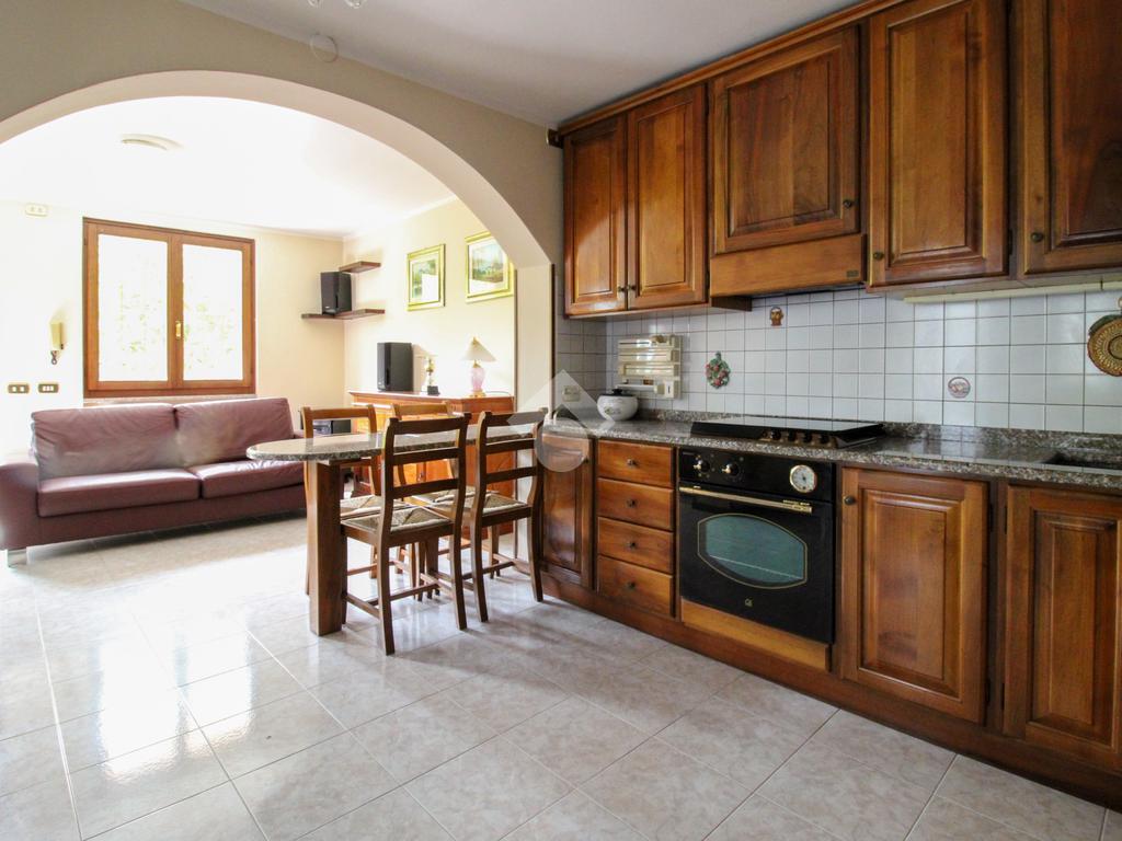 Proseguendo, troviamo la cucina a vista che consente, tramite portafinestra, l'accesso al cortile.